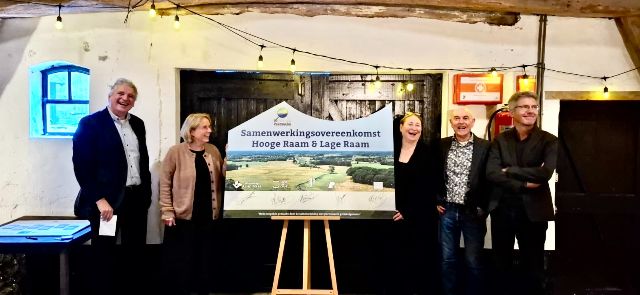 | Waterschap Aa en Maas, gemeente Land van Cuijk, Brabants Landschap, Staatsbosbeheer en Groen Ontwikkelfonds Brabant tekenden symbolisch voor de start van de herinrichting van de Raamvallei. Een belangrijke stap op weg naar meer natuur en beter waterbeheer. |